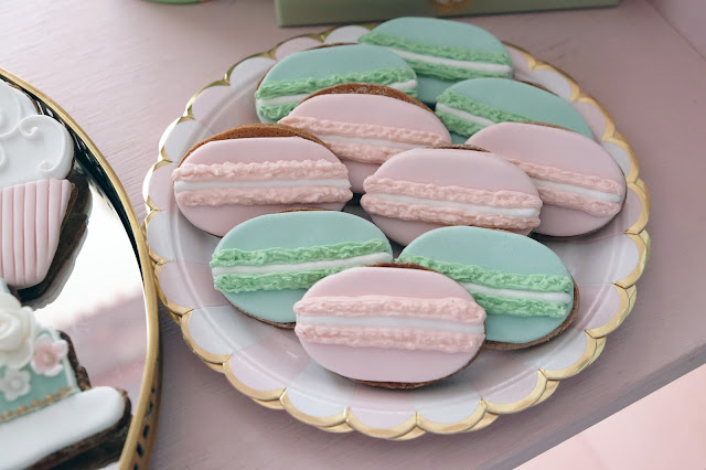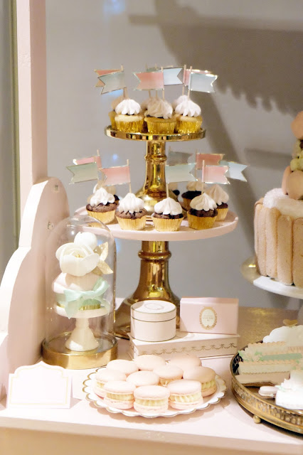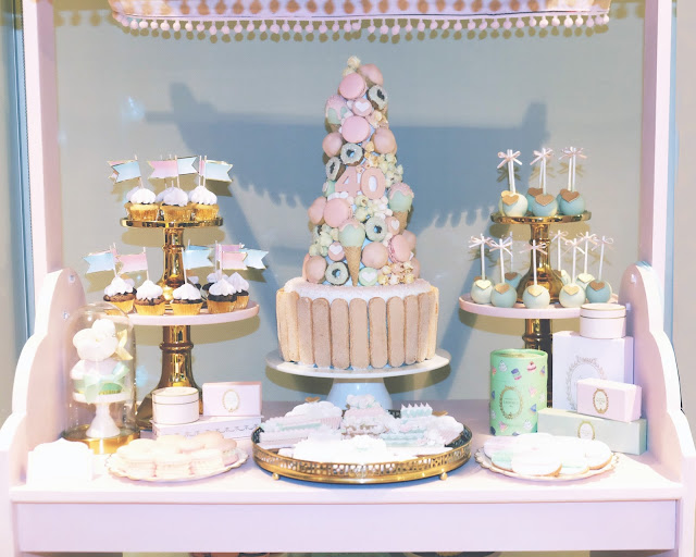 Como já devem ter reparado eu adoro a Ladurée e este ano a sua colecção de Verão foi a Mademoiselle Macaron. Simplesmente perfeito para a ocasião! A partir daí foi fácil desenhar todos os restantes doces a condizer com o tema e o bolo e a palete de cores. Mais uma vez usei o móvel que o meu pai me fez, pois era o cenário ideal, a lembrar uma pequena patisserie como eu queria.