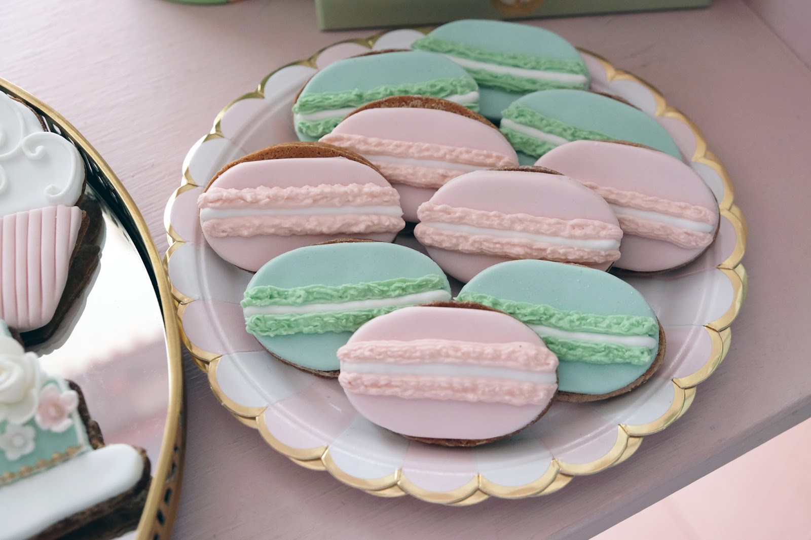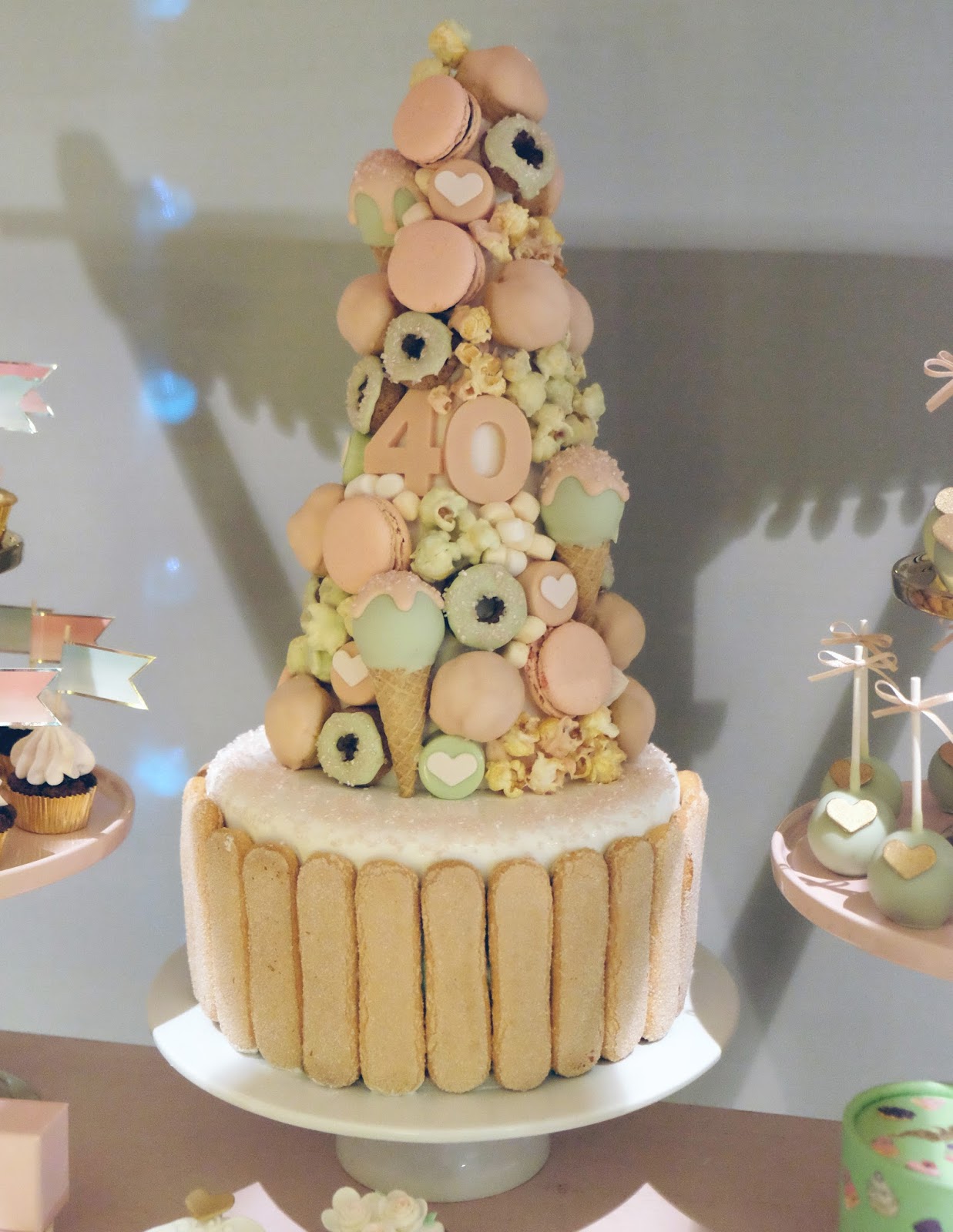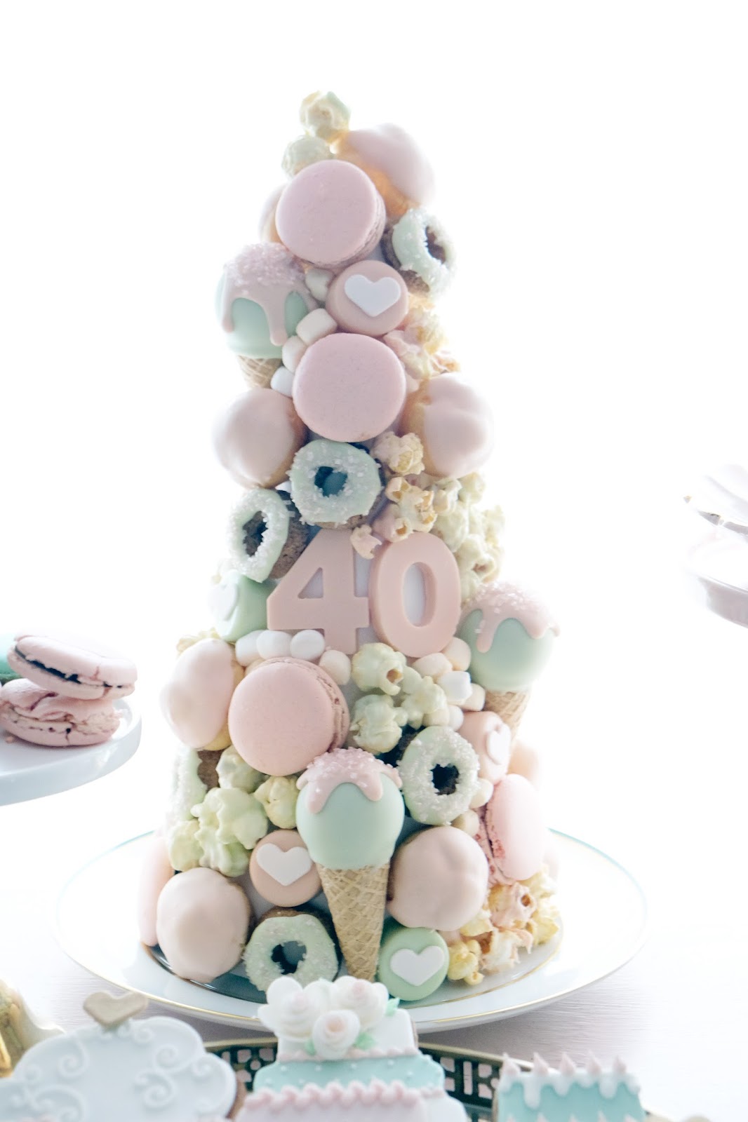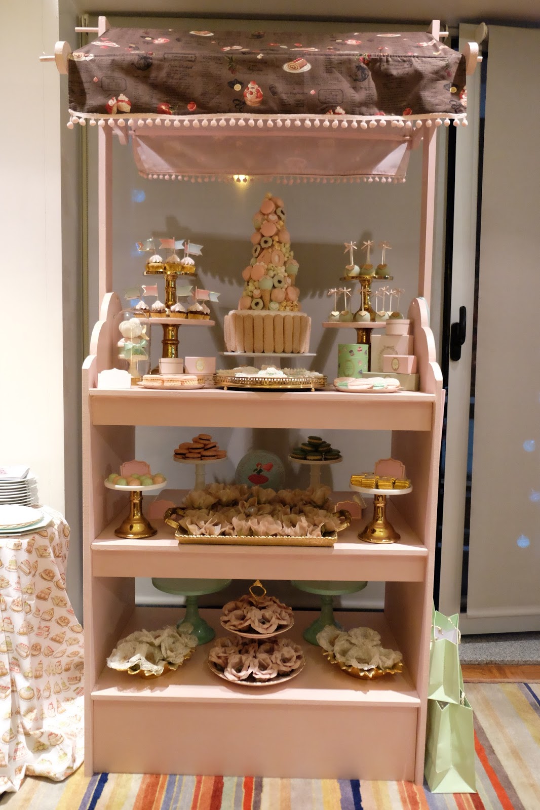 Como já devem ter reparado eu adoro a Ladurée e este ano a sua colecção de Verão foi a Mademoiselle Macaron. Simplesmente perfeito para a ocasião! A partir daí foi fácil desenhar todos os restantes doces a condizer com o tema e o bolo e a palete de cores. Mais uma vez usei o móvel que o meu pai me fez, pois era o cenário ideal, a lembrar uma pequena patisserie como eu queria.