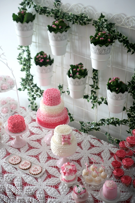 É tradição no dia de Reis retirar-se todas as decorações de Natal cá de casa. Este ano ao fazê-lo a casa pareceu-me tão despida! Já nos começavamos a habituar a todos aqueles docinhos e à mesa tão enfeitada mal se entrava em casa.... É claro que não consegui resistir e resolvi montar uma nova mesa de doces, desta vez em tons de rosa e branco para ser bem diferente das anteriores. A ideia é servir de expositor de todos os diferentes tipos de doces que eu faço: cupcakes, mini bolos, cake pops, bolos de andares, bolachinhas decoradas, suspiros, tudo devidamente embelezado por flores e folhos em açucar. É que numa festa, se em vez do típico bolo tivermos uma variedade de doces decorados e todos a condizer a nossa mesa fica incomparávelmente mais bonita!