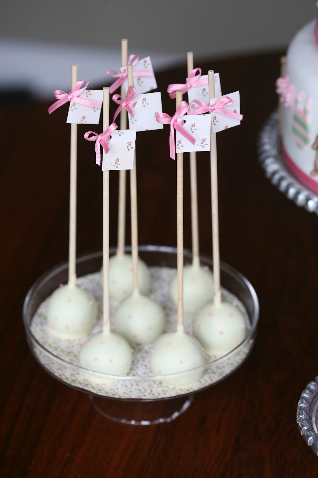 nos cake pops utilizei o mesmo tema de cartões das bolachas para forrar o prato de pé e para criar placas com laçarotes no topo dos pauzinhos