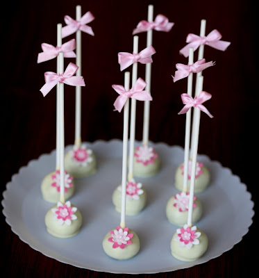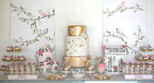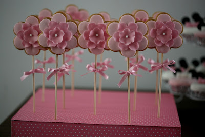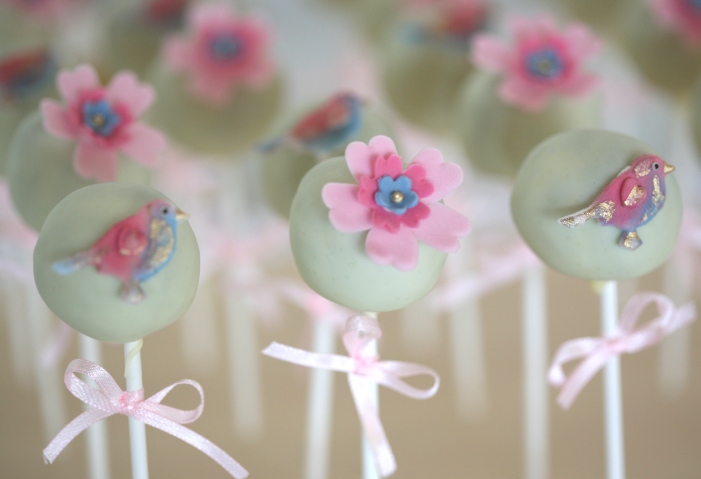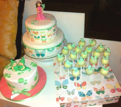 | Os cake pops estavam enquadrados no arranjo da mesa, e o tema era borboletas a condizer com a toalha e os marcadores |