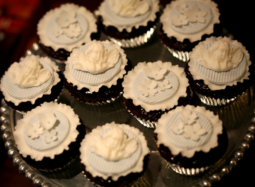 os cupcakes rosa levavam placa branca com pintinhas rosa e rosas de Santa Teresinha a condizer com o mini bolo e os brancos placa rosa e o Anjinho a condizer com o bolo de Batizado